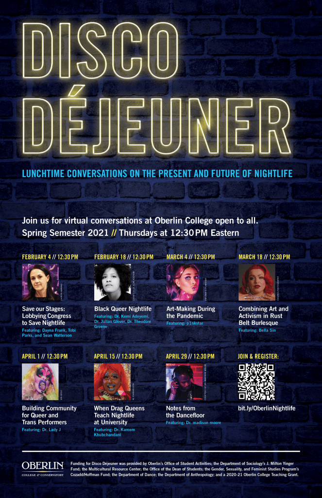 To support my nightlife class during the COVID-19 pandemic, Assistant Professor of Dance Al Evangelista and I hosted a midday speaker series Disco Déjeuner: Lunchtime Conversations on the Future of Nightlife. Speakers included multi-hyphenate artists, activists, academics, and entrepreneurs discussing the way forward. A list of the speakers and more information can be found here.